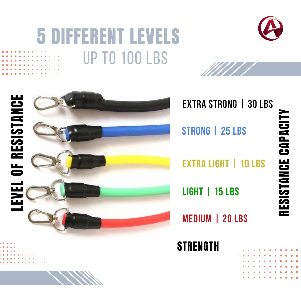 The set includes five assorted colour-coded resistance bands with different resistance capacities. Users can use one band or combine multiple bands to increase intensity, with a combined maximum resistance of up to 100 lbs.