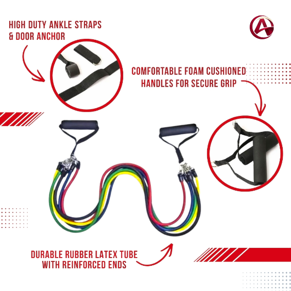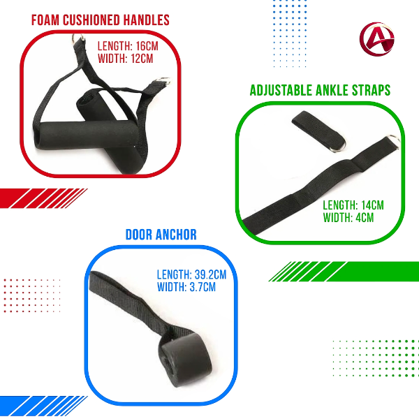 The kit includes foam cushioned handles designed for a secure and comfortable grip. Adjustable nylon ankle straps allow lower-body exercises, while the heavy-duty door anchor expands exercise options.